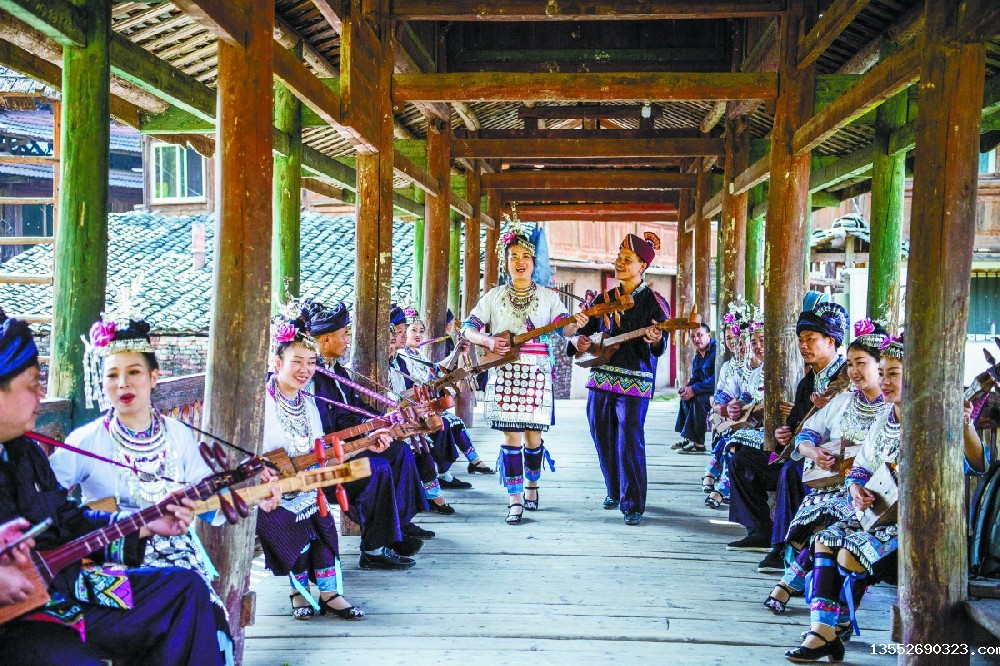 节日里,地灵侗寨男女穿着盛装在风雨桥上弹琵琶唱情歌。记者 游拥军 摄