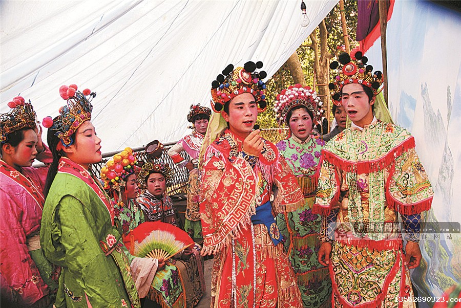 在演出当中,后台演员为前台演员帮腔,渲染舞台气氛。