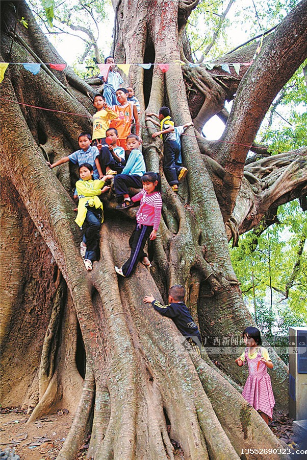 在凌云县朝里瑶族乡九联村那荷屯,孩子们爬上古榕树观看演出。
