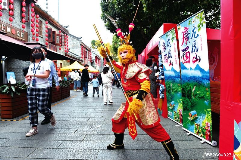 隆安龙虎山旅游展位“猴王“上场助阵销售旅游商品。