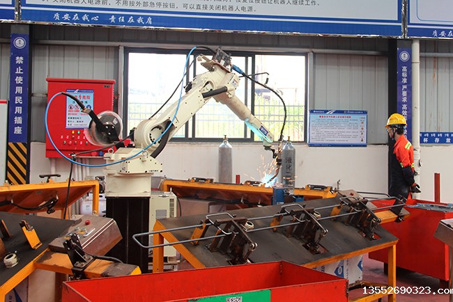 亮点工程之一全自动焊接机器人,可设置各种程序对不同钢筋焊接质量要求控制精准,免去人工焊接的繁杂工序,有效提高焊接加工质量。每天综合加工钢筋数量15T,人工每天焊接综合数量为10t,提高50%的焊接效率,且焊接质量大大增加。桥面铺装预埋门字筋、盖梁骨架及相关钢筋的连接均可采用全自动CO?保护焊机器人进行焊接,确保钢筋焊接质量,可以在空间中各个面之间相互转换加工,能适应各种复杂的工况,四个操作平台同时使用,大大提高了焊接机械人的使用效率。
