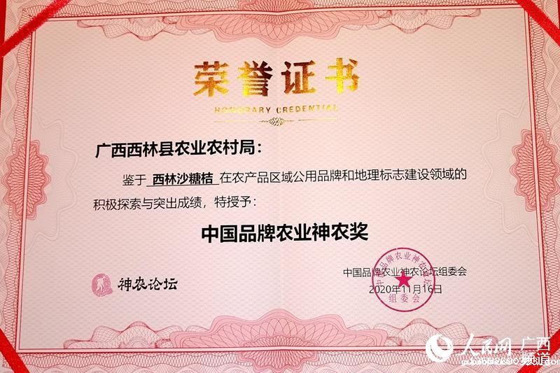 期间,论坛组委会共收到全国各地申报的品牌材料418件,经过神农论坛专家评审委员会严格评审,评选出了44个具有影响力、公信力和标杆性的区域公用品牌、企业、产品品牌,其中西林县选送的西林沙糖桔品牌,由于在农产品区域公用品牌和地理标志建设领域的积极探索与突出成绩荣获“中国品牌农业神农奖“。(王勇 陆海城 王正庭)