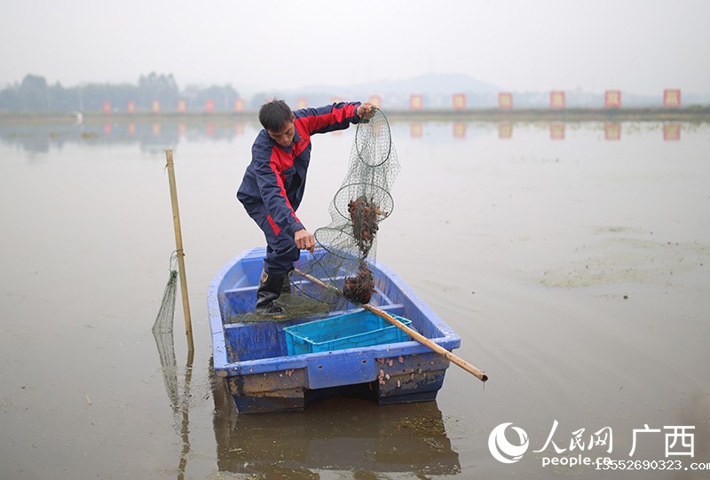 人民网桂平12月15日电 (沈泉池、吴明江)“吃小龙虾不用跑外边卖了,家门口就养有。“12月15日上午,广西贵港桂平市石咀镇旺龙村村民周石清一边在虾塘喂料一边说。去年7月,在外打工多年的她从广东回到家乡,在村口的小龙虾基地上班。“在家里上班能照顾老人小孩,收入也算下来和在外面差不多,非常方便。“周石清对家门口的这份工作十分满意。