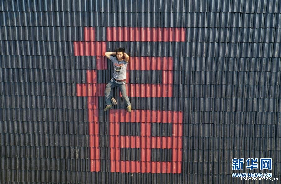 在广西融水苗族自治县同练瑶族乡大坪村下大弄屯,脱贫户王道兵躺在即将完成危房改造的房顶(5月12日摄,无人机照片)。