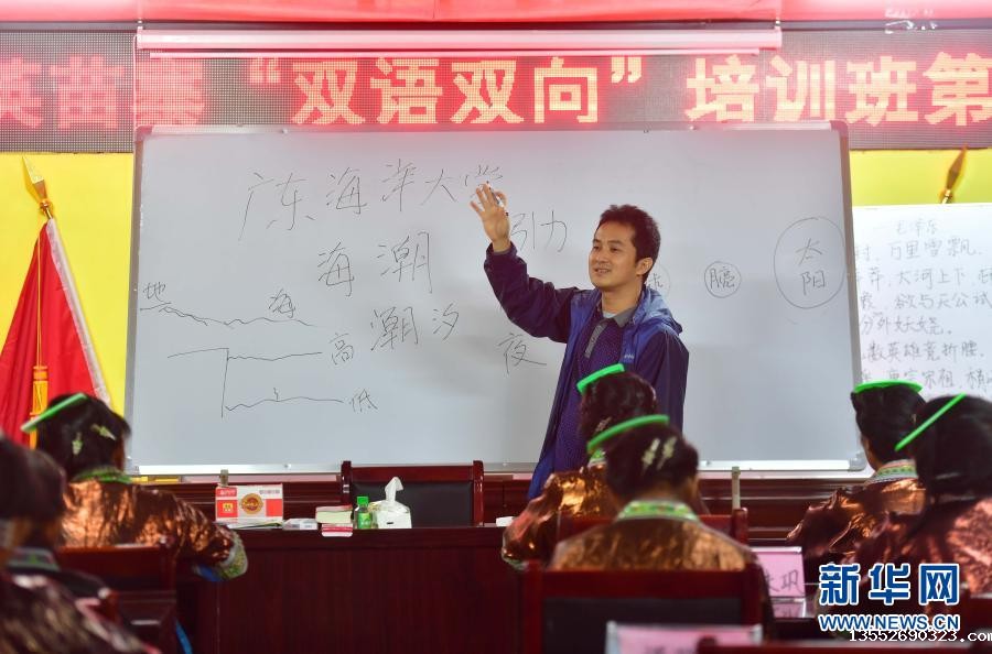 在广西融水苗族自治县杆洞乡党鸠村乌英苗寨,广东海洋大学教授陈涛在给夜校班的妇女们上课(10月16日摄)。