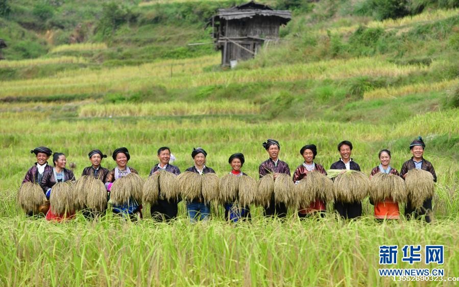 在广西融水苗族自治县良寨乡大里村,村民们在展示刚刚收割的脱贫特色产品——紫黑香糯(2018年10月12日摄)。