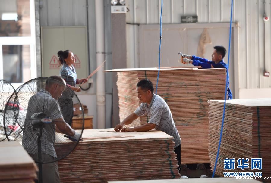在融水苗族自治县粤桂扶贫协作产业园一家木业公司的巾帼扶贫车间,工人在生产线上作业(2019年8月25日摄)。