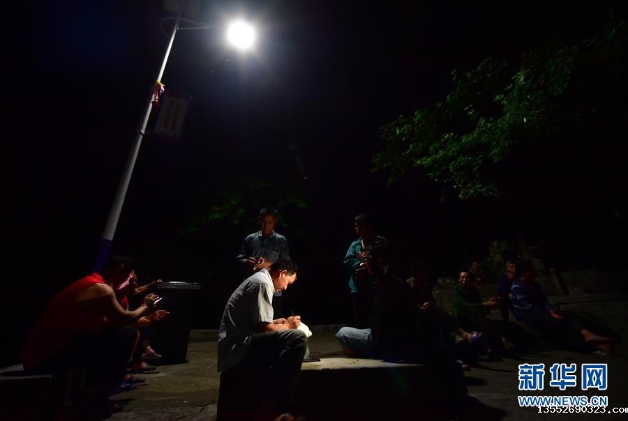 在广西融水苗族自治县杆洞乡党鸠村,村支书梁成张(前)在路灯下工作(5月13日摄,无人机照片)。