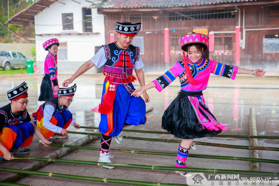 灵川县大境瑶族乡松江村倘竹坪屯,瑶族同胞们身穿节日盛装,开展跳竹竿、对山歌等活动,欢度“壮族三月三“。石玲 龚炳旭 摄