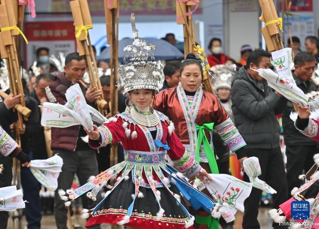 2月2日,融水苗族自治县杆洞乡党鸠村苗族同胞在吹芦笙。