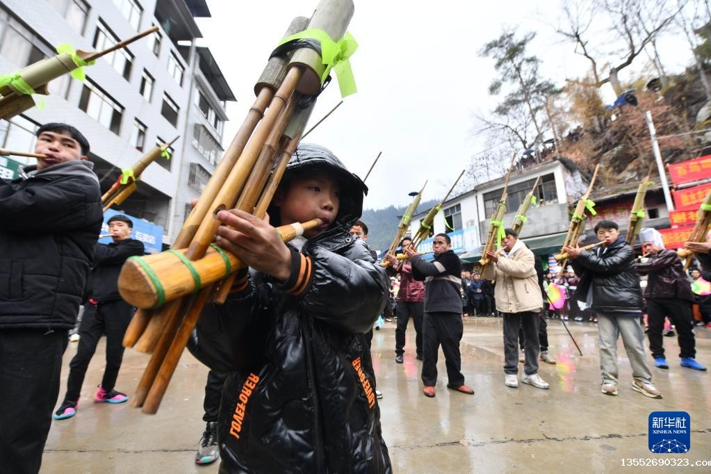 2月2日,融水苗族自治县杆洞乡党鸠村苗族少年在吹芦笙。