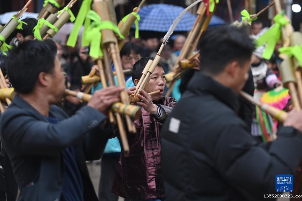 2月2日,融水苗族自治县杆洞乡各族群众在吹奏芦笙。