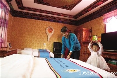西藏山南市乃东区扎西曲登社区居民索朗央金在民宿内整理床铺。次仁龙布摄