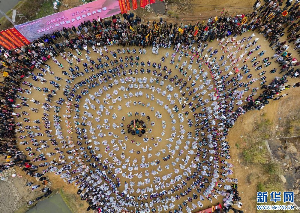 2月5日,在广西融水苗族自治县杆洞乡百鸟衣芦笙坡会上,各族群众一起跳芦笙踩堂舞(无人机照片)。