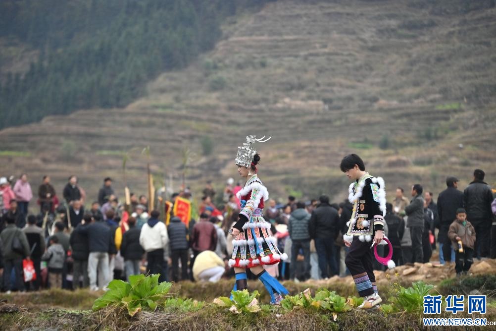 2月5日,人们在融水苗族自治县杆洞乡百鸟衣芦笙坡会上观看民俗展演。