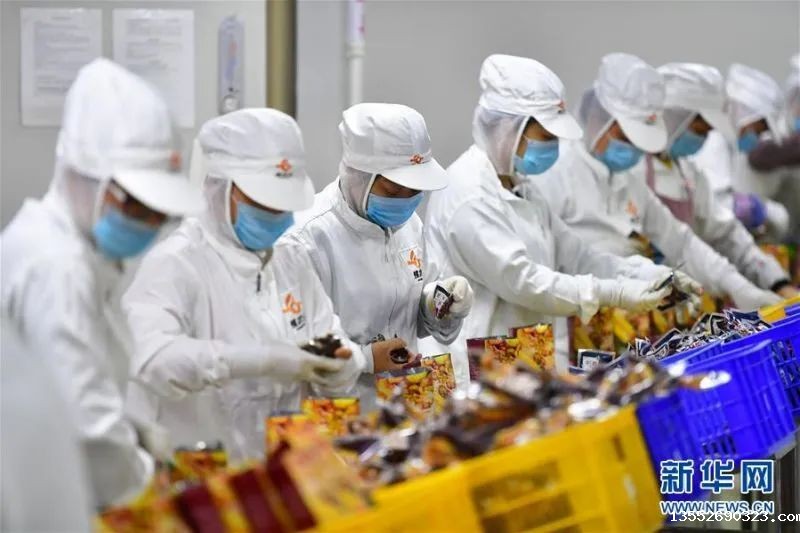 ▲在柳州市螺蛳粉产业园一家生产车间,工人在生产线上包装螺蛳粉。