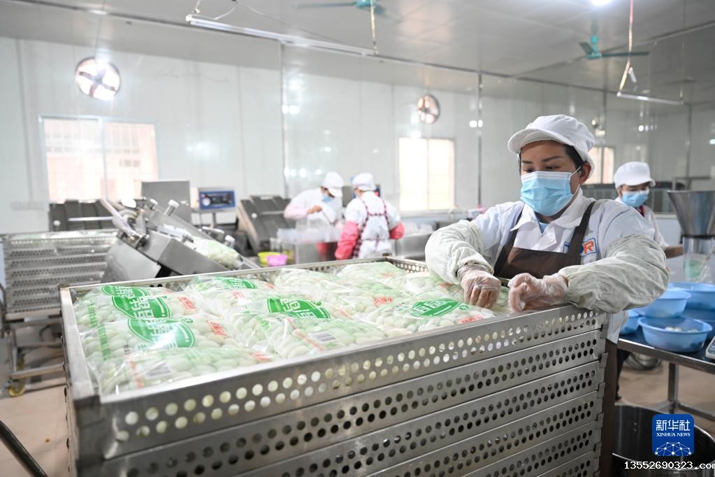 3月27日,在柳州市柳城县社冲乡柳州螺蛳粉原材料基地里,工人在鹌鹑蛋加工厂车间里忙碌。