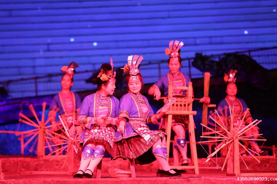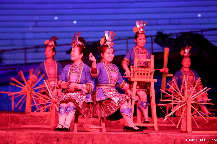 2月15日,在三江侗族自治县侗乡鸟巢剧院,演员们在绣鞋垫、纺纱。