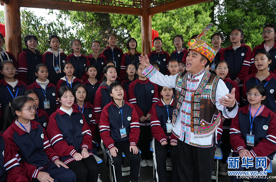 在广西柳州融水苗族自治县民族中学,广西“山歌王”杨仕余在教唱融水山歌。新华网发 龙涛 摄