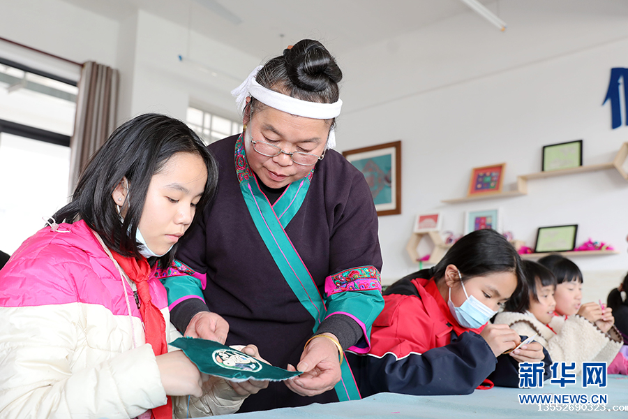 在广西柳州三江侗族自治县古宜镇江川小学,同学们在学习制作侗族刺绣。新华网发 龚普康 摄