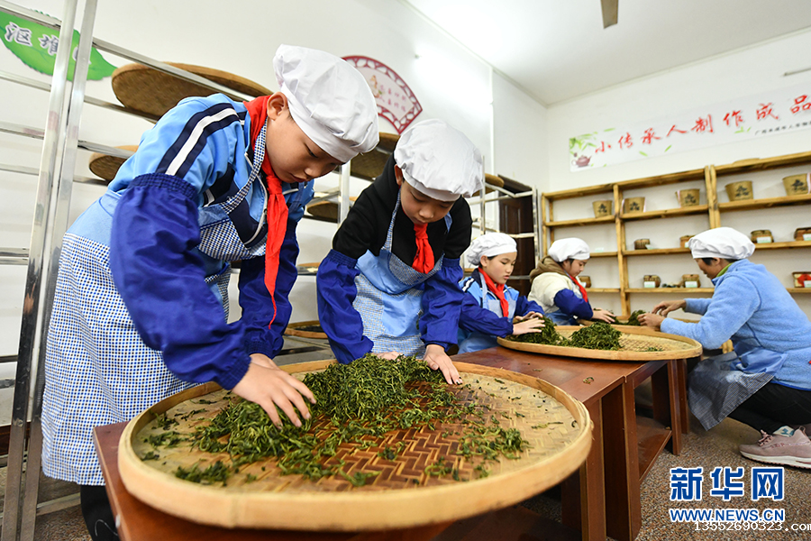 在广西梧州市苍梧县六堡镇中心校,同学们在学习制茶。新华社记者 黄孝邦 摄