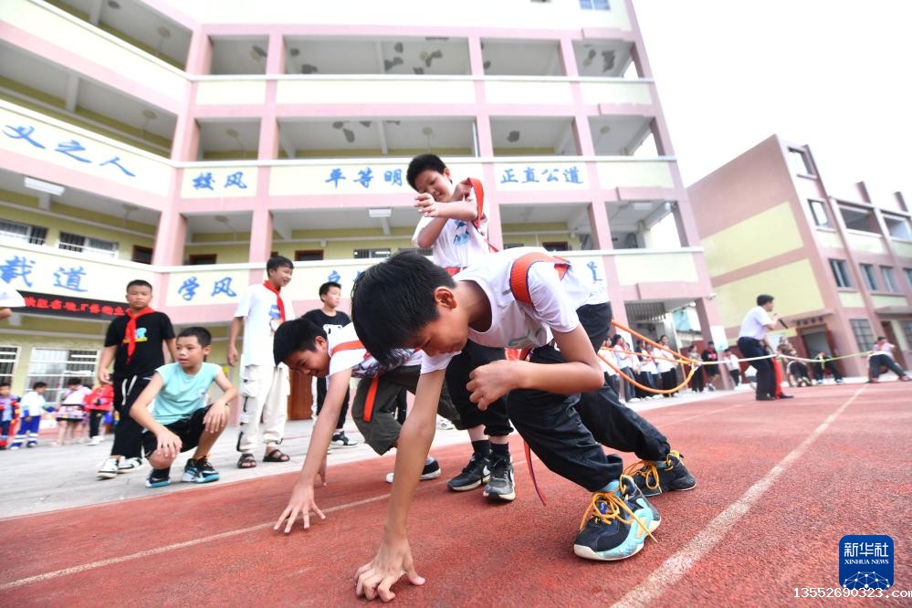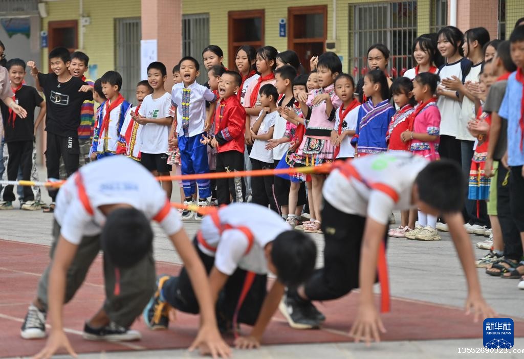 9月26日,在梧州市长洲区古道小学,学生们在大课间进行“大象拔河”。