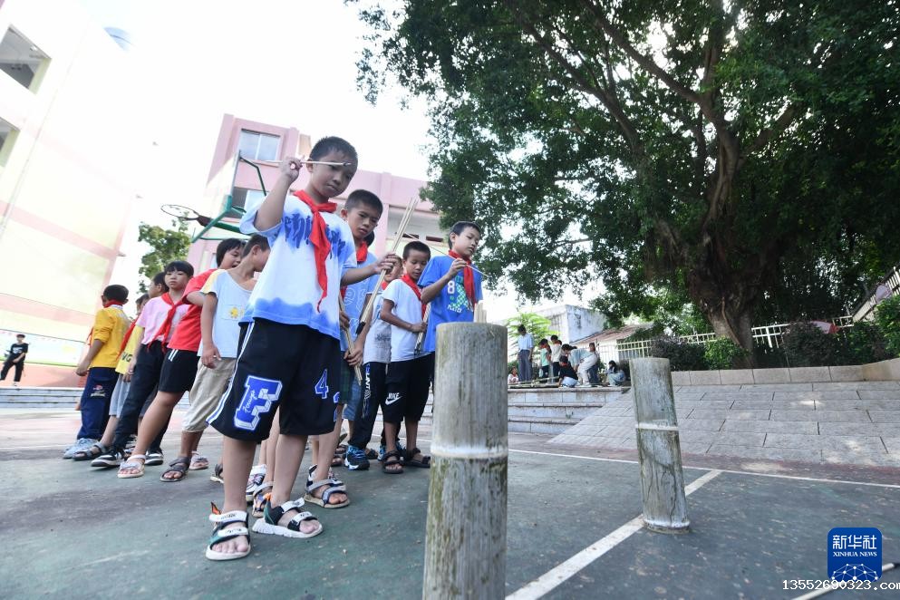 9月26日,在梧州市长洲区古道小学,学生们在大课间练习投壶。