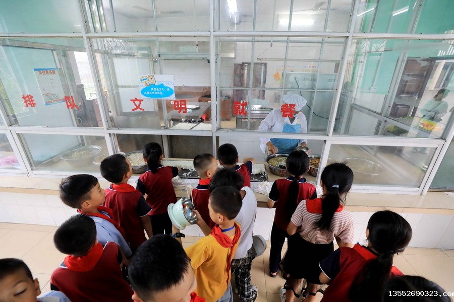 8月30日,在柳州市融安县大坡乡岗伟村小学,学生们在排队领取营养午餐。(谭凯兴 摄)