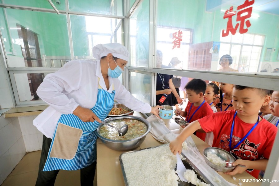 8月30日,在柳州市融安县大坡乡岗伟村小学,一名工作人员在为学生加菜。(谭凯兴 摄)