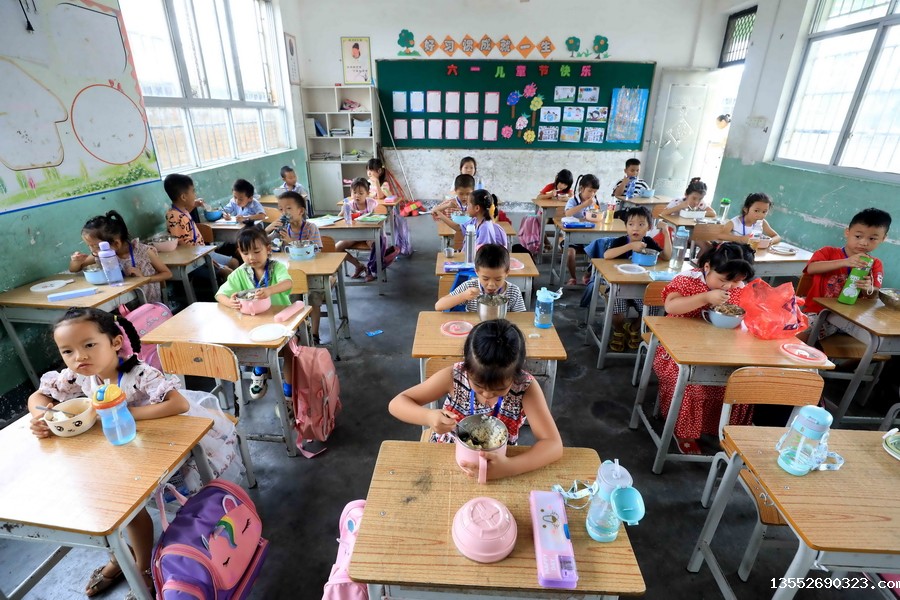 8月30日,在柳州市融安县大坡乡岗伟村小学,学生们在教室里吃营养午餐。(谭凯兴 摄)