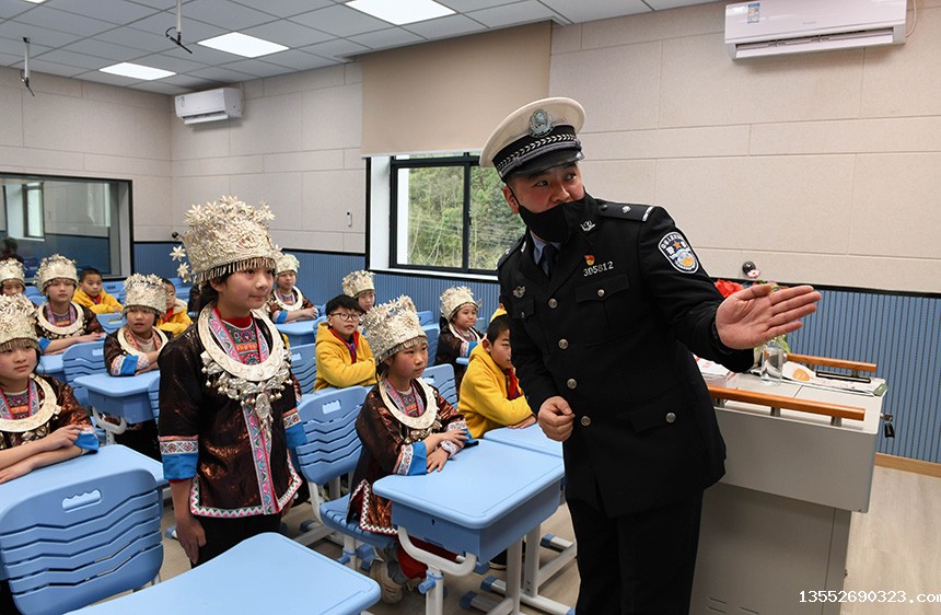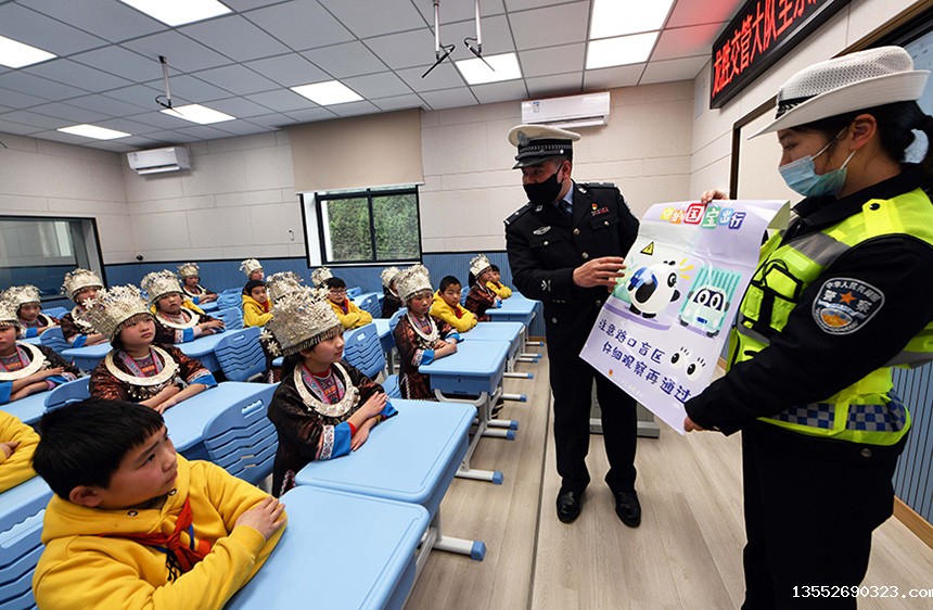 在广西龙胜各族自治县乐江镇乐江小学,龙胜交管大队民警在给学生们讲解交通安全法规。
