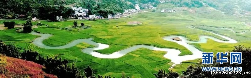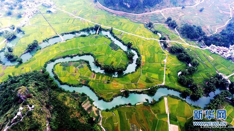 碧绿的河水在河池市东兰县武篆镇江平村的田野上形成一个巨大的“太极”图案。高东风摄