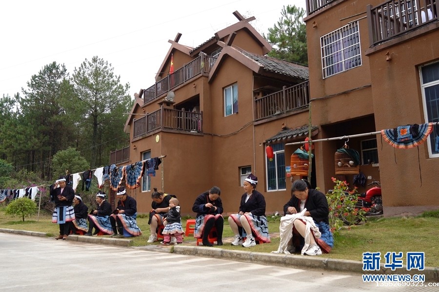 在河池市南丹县里湖瑶族乡朵努社区,白裤瑶妇女正在制作瑶族服饰。新华网 刘君 摄
