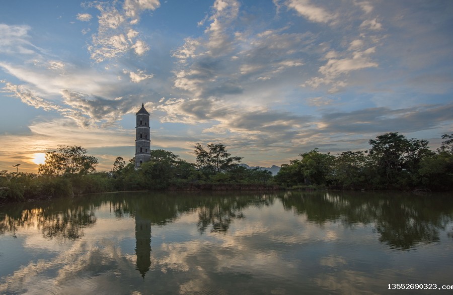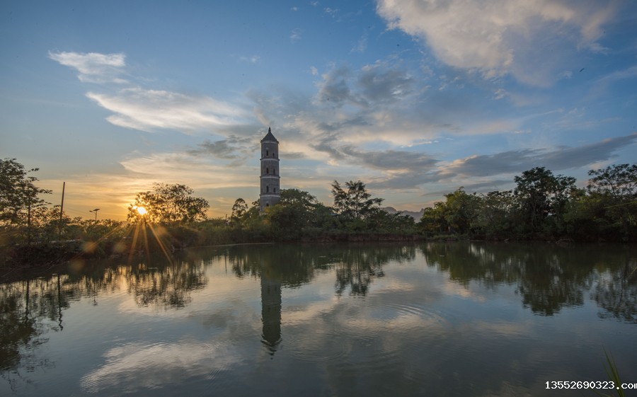 蓉峰塔,座落于宁明县城西郊,始建于清代1821年,距今已有200年历史。蓉峰塔高43.44米,共五层,从二层起,分别题名为“珠连“、“璧合“、“梯云“、“取月“;配有“苍龙布水“、“彩凤独立“、“瑞鹿含芝“、“金鲤朝龙“为题的壁画。塔顶为尖嘴葫芦状,瓦檐六角各垂吊一个风铃。塔侧有一古榕,绿色枝叶拦腰拥抱古塔,形成树抱塔的奇观。塔东侧有一小湖,登塔眺望,荷城新姿、明江秀色、田园风光尽收眼底,是宁明县三山四水十大景中的经典景点之一。(周贻刚)