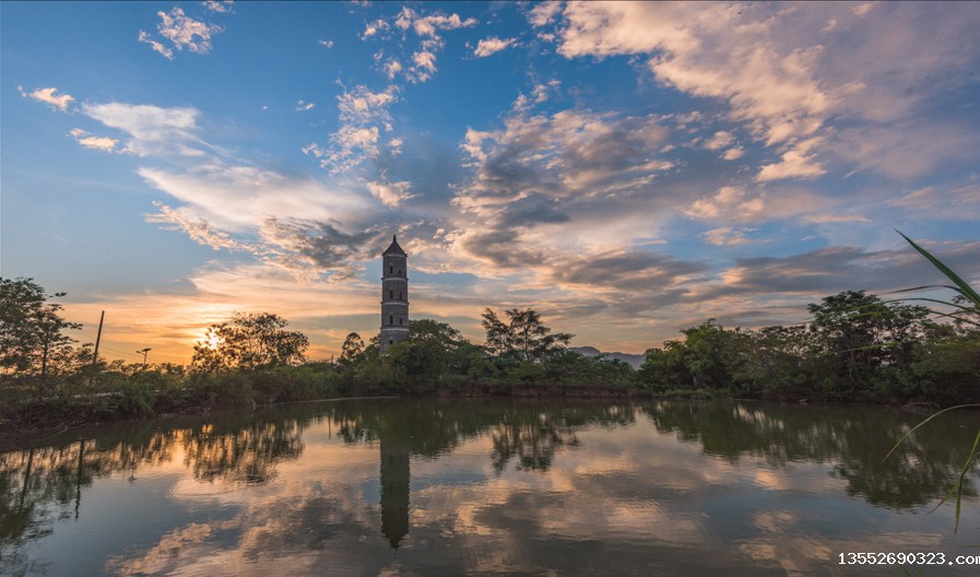 9月5日,多彩晚霞映衬下的蓉峯古塔与美丽多姿的田园美景形成一幅美轮美奂的摄影水彩画。(黄海摄)