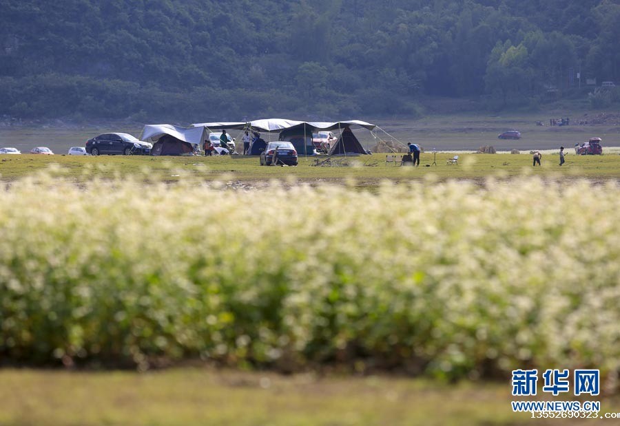 游客在柳州市柳城县古砦仫佬族乡独山水库库区的荞麦花丛中游玩;