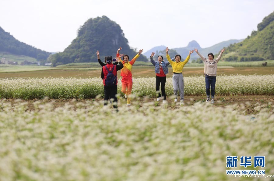 游客在柳州市柳城县古砦仫佬族乡独山水库库区的荞麦花丛中拍照留影;