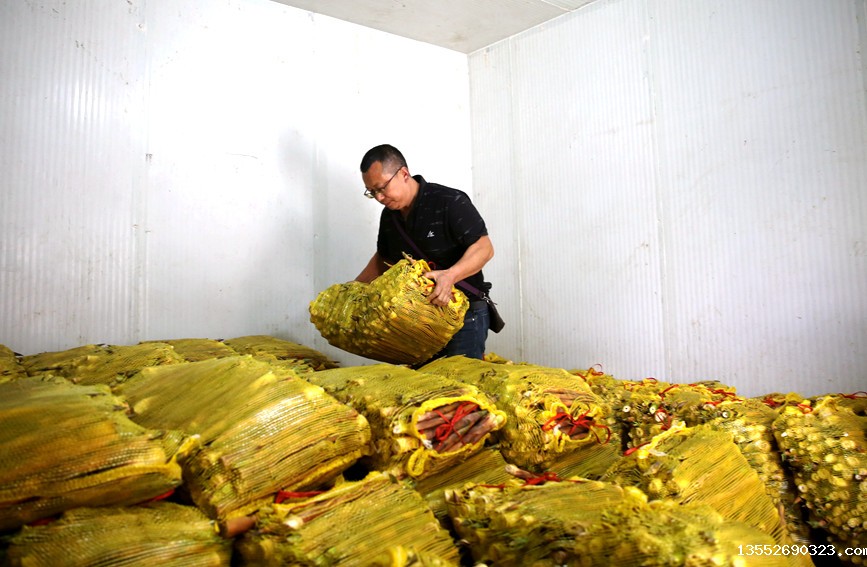 周老板在冻库堆放新鲜竹笋。潘勇干摄