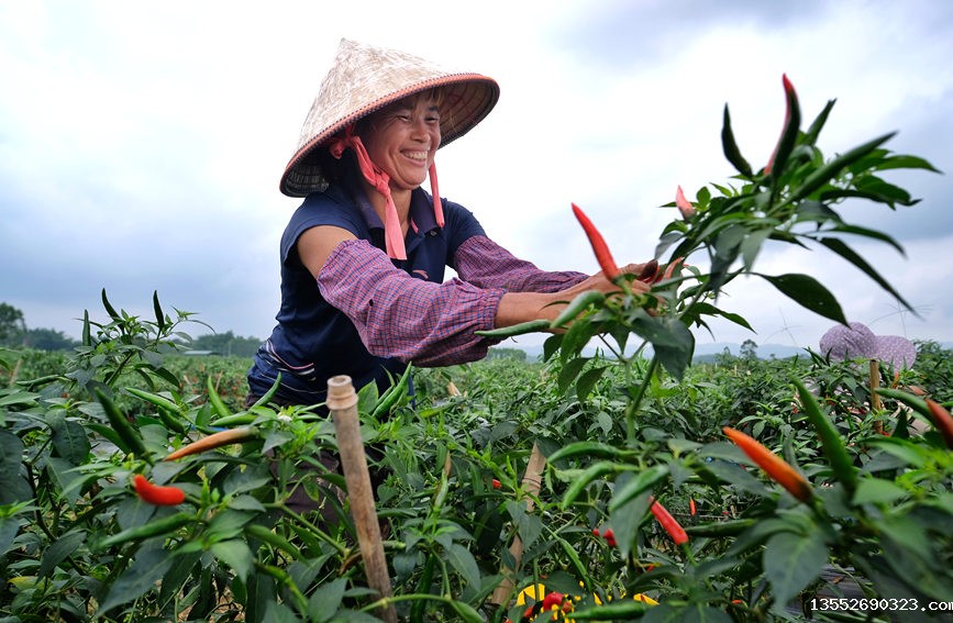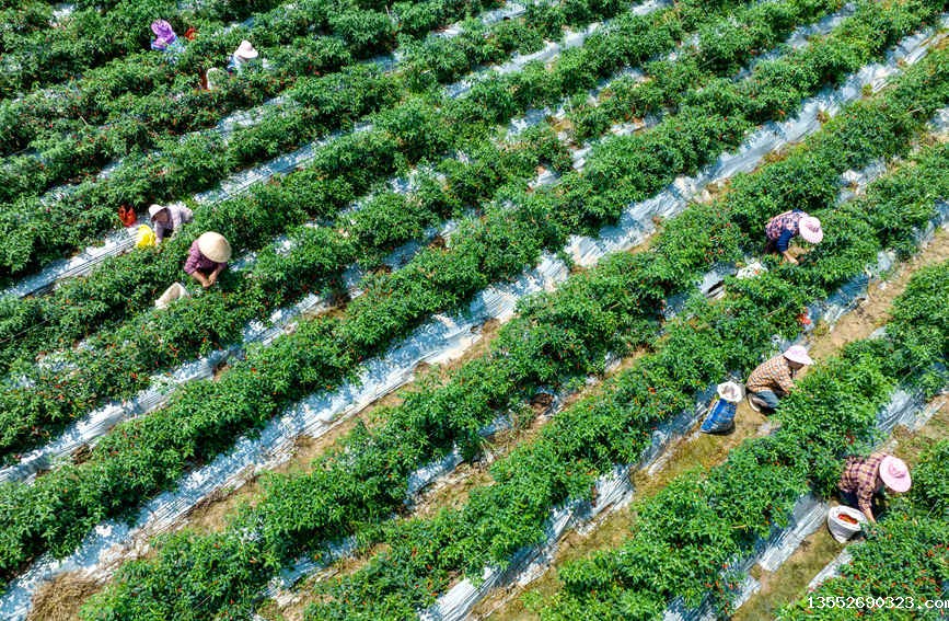 村民在辣椒基地采摘辣椒。张晓冬摄