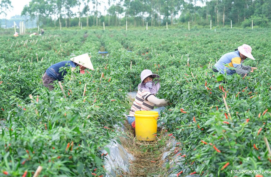 前述辣椒园位于广西钦州市钦北区平吉镇九佰垌国家级现代农业产业园区内。为了促进村集体经济收入,当地湴塘、广平等11个村与广西为农指天椒种植有限公司签订合作协议,11个村出资55万元种植110亩指天椒,交由该公司种植管理和销售一条龙服务。