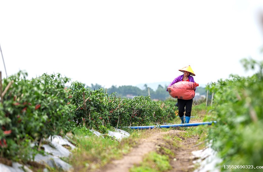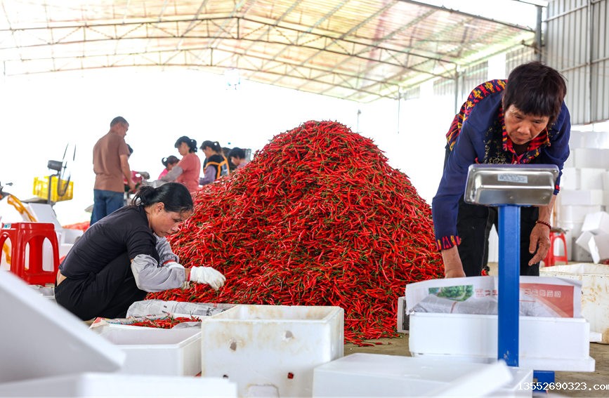 人民网钦州6月7日电 时下,正值指天椒采摘旺季,在广西为农指天椒种植有限公司500亩辣椒园内,农户们将刚采摘好的辣椒从田间地头运到加工厂,从晾干、挑选到包装运输,现场一派热火朝天的景象。