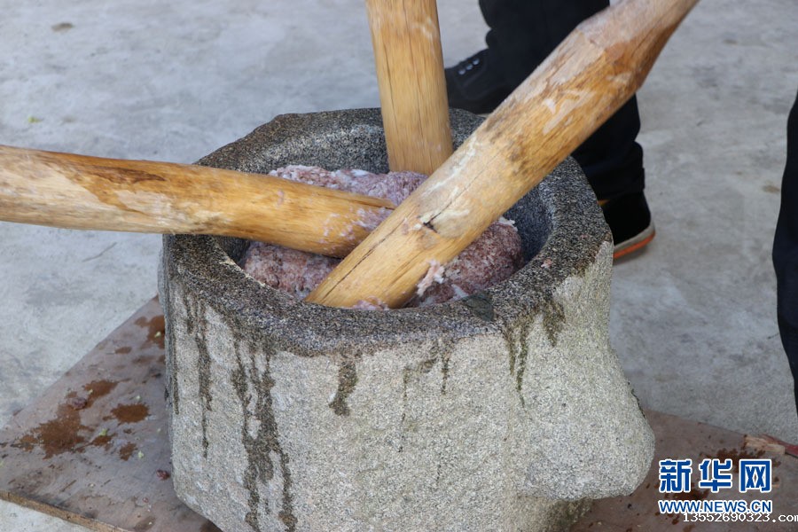 清晨6点,大湾村村民邹顺煌家就燃起了炊火,母亲正在烧水,准备蒸当天的第一锅糯米团。邹顺煌和父亲则在庭院里洗着工具,为打糍粑做准备。上好的糯米经水淘洗、浸泡后,被放入甑子里蒸熟,趁热倒入石臼中,准备正式开“捶”。