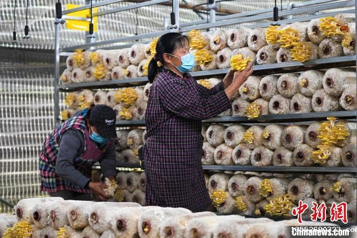 图为工人在采摘榆黄菇。黄少将摄中新网百色4月1日电(黄少将 罗秀麦)春雨绵绵,滋养万物。近日,在广西百色市德保县东凌镇多俄村食用菌示范基地里,工作人员正有条不紊地进行套袋制作菌棒、消毒接种菌种、整齐码放菌棒,观察菌菇生长情况、监测大棚温度、采摘筛选菌菇等各项工作,一派忙碌的景象。东凌镇党委书记...