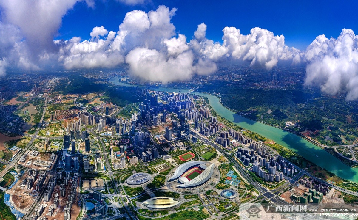 蓝天白云下的南宁市区(五象新区-南宁自贸片区)全景。记者 周军 摄