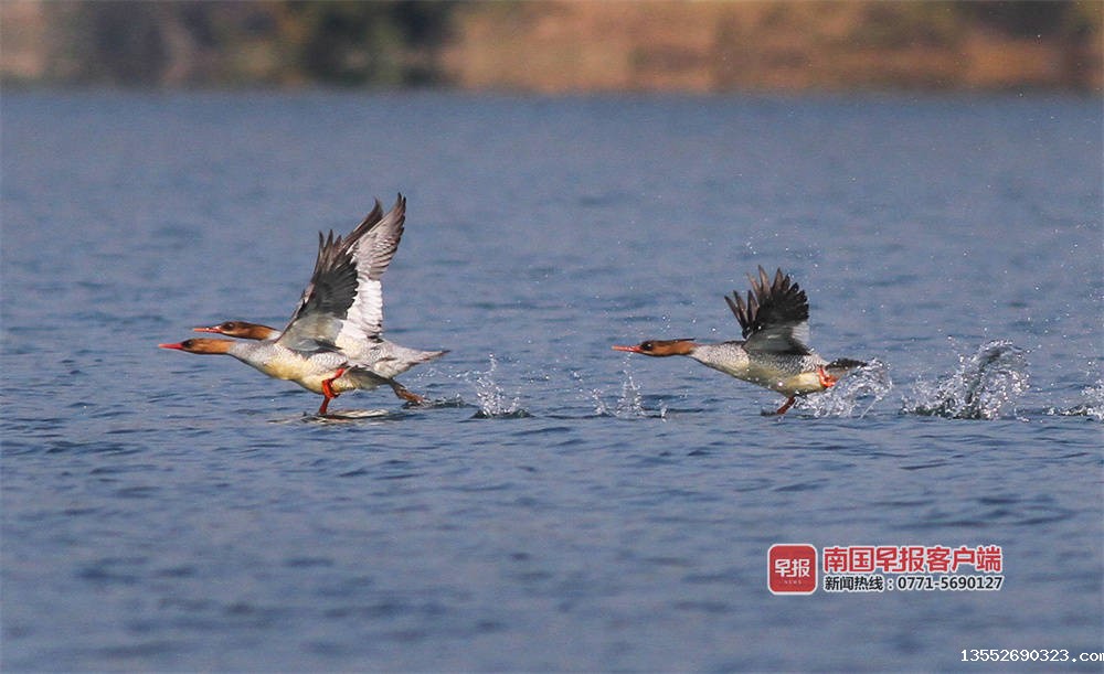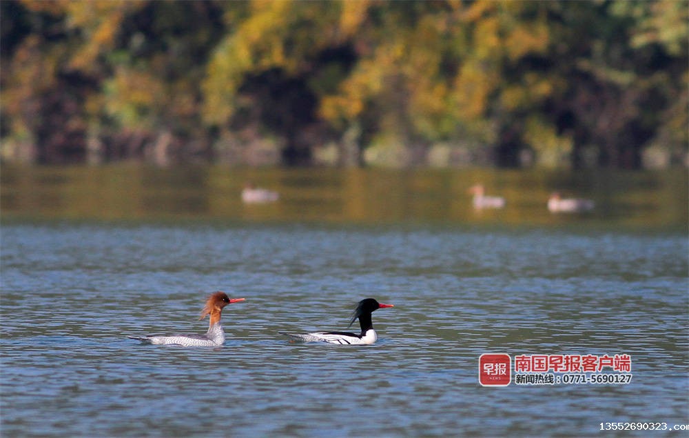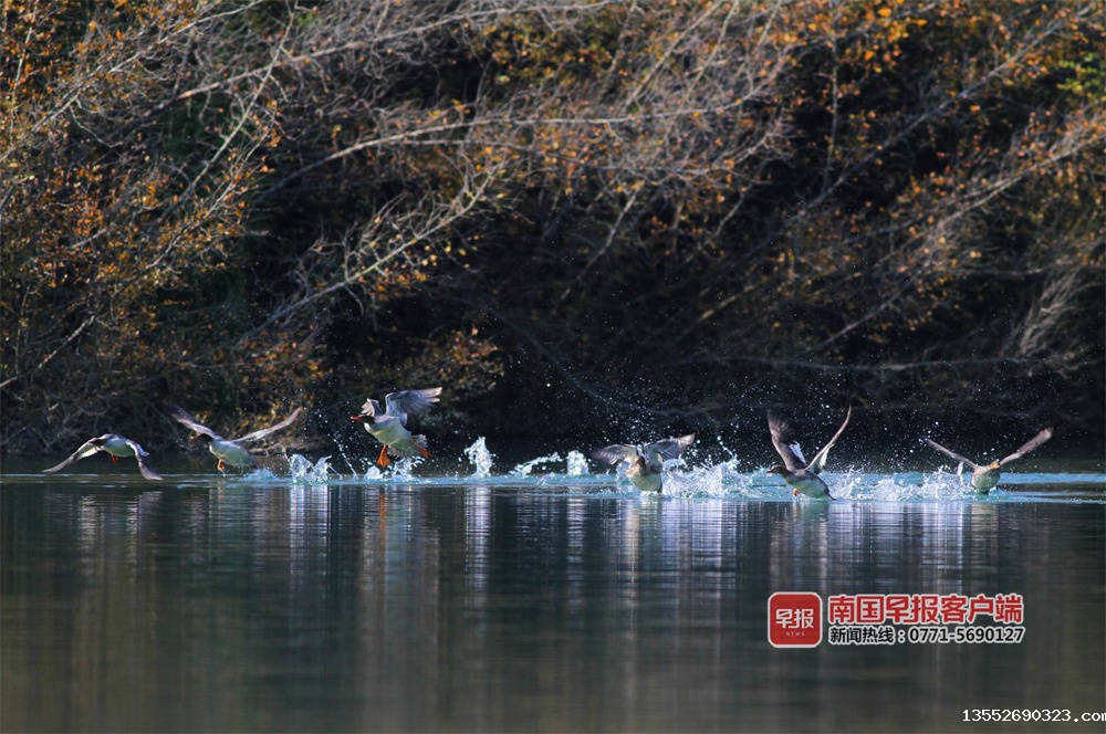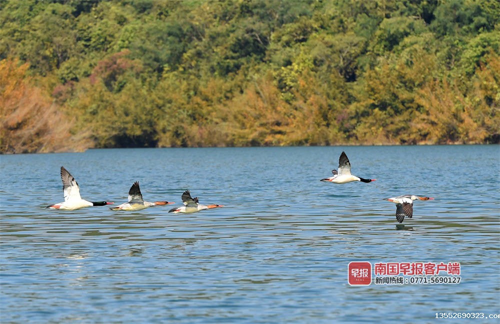 “几年前,每年零星发现一两只,开始叫不上名字,很难拍到,没有过多关注。去年成群来,我们查询发现是中华秋沙鸭。“百色市澄碧河水库管理中心何主任介绍,它们一般是头年的11月左右到来,次年的3月份左右离开,时间长达5个月。今年10月底到来的种群,数量明显增多,初步观测有数十只。
