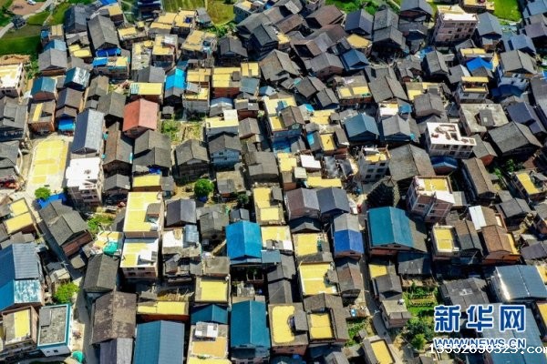 立秋过后,柳州三江侗族自治县良口乡南寨村种植的优质稻收割已近尾声,村民们抢抓晴好天气,利用自家楼顶及屋边操场晒秋,金黄稻谷与特色侗寨交相辉映,满村尽是黄金屋一幅幅生动多彩的金秋丰收图呈现在眼前。 无人机航拍三江南寨村的晒秋美景。龚普康摄 无人机航拍三江南寨村的晒秋美景。龚...