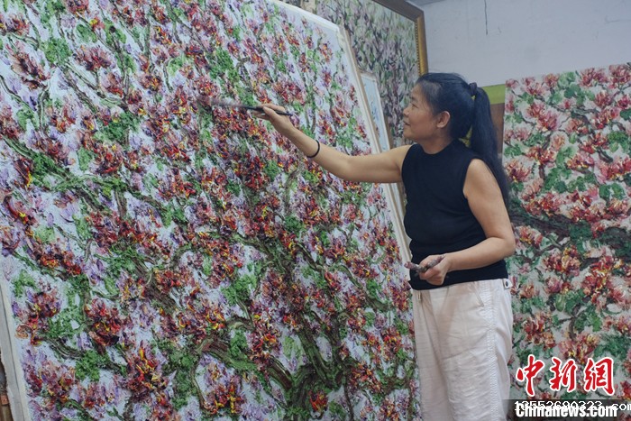 近期,广西柳州市近30万株洋紫荆竞相开放。该市的大街小巷被大片的洋紫荆包围,宛如一片“粉色海洋”。在画家林建莉的工作室内,她正站在椅子上,用画笔肆意描绘着一幅巨型的洋紫荆油画。