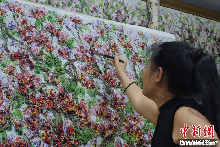 图为3月22日,广西柳州,林建莉的工作室内,她正站在椅子上,用画笔肆意描绘着一幅巨型的洋紫荆油画。 中新社记者 刘俊聪 摄