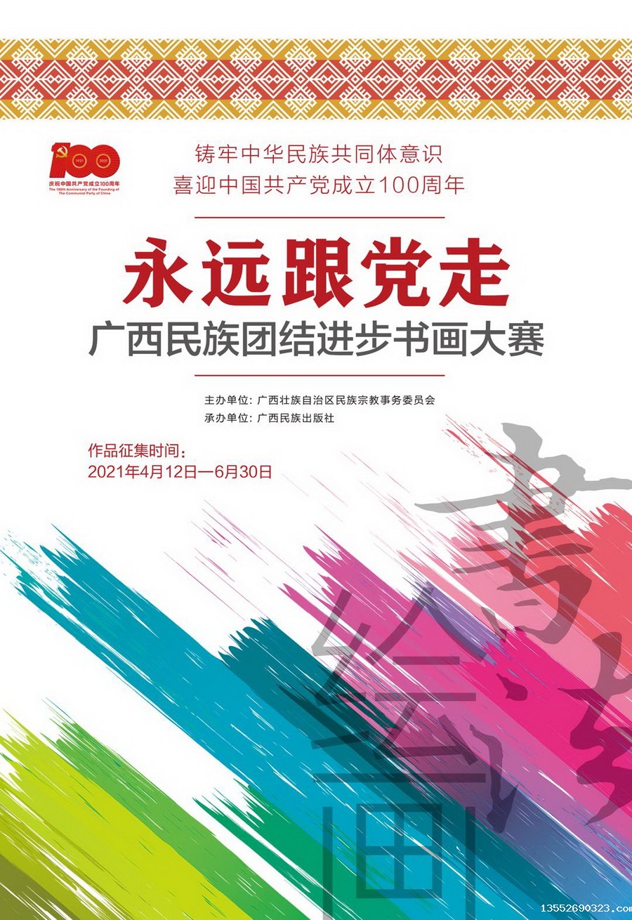 本报讯(记者 黄浩云)4月12日,“永远跟党走——广西民族团结进步书画大赛“启动仪式在南宁市天桃实验学校翠竹校区举行。此次大赛由广西壮族自治区民族宗教事务委员会主办,广西民族出版社承办。活动主题为“铸牢中华民族共同体意识,喜迎中国共产党成立100周年“。自治区民宗委党组成员、副主任翚永红,自治区民宗委二级巡视员覃汉华出席启动仪式。